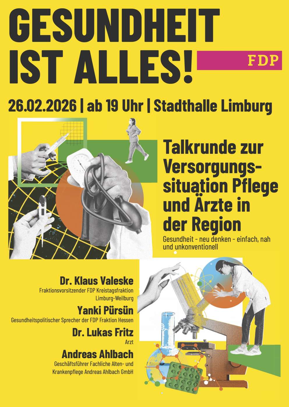 Limburg – Am Donnerstag, 26. Februar 2026 (19.00 Uhr, Konferenzraum der Stadthalle Limburg), lädt die FDP Limburg-Weilburg zum „Talk GESUNDHEIT“ ein. Im Fokus der Podiumsdiskussion steht dabei die aktuelle Lage des Gesundheits- und Pflegesektors im Landkreis Limburg-Weilburg – mit seinen Herausforderungen, Chancen und Zukunftsperspektiven.
