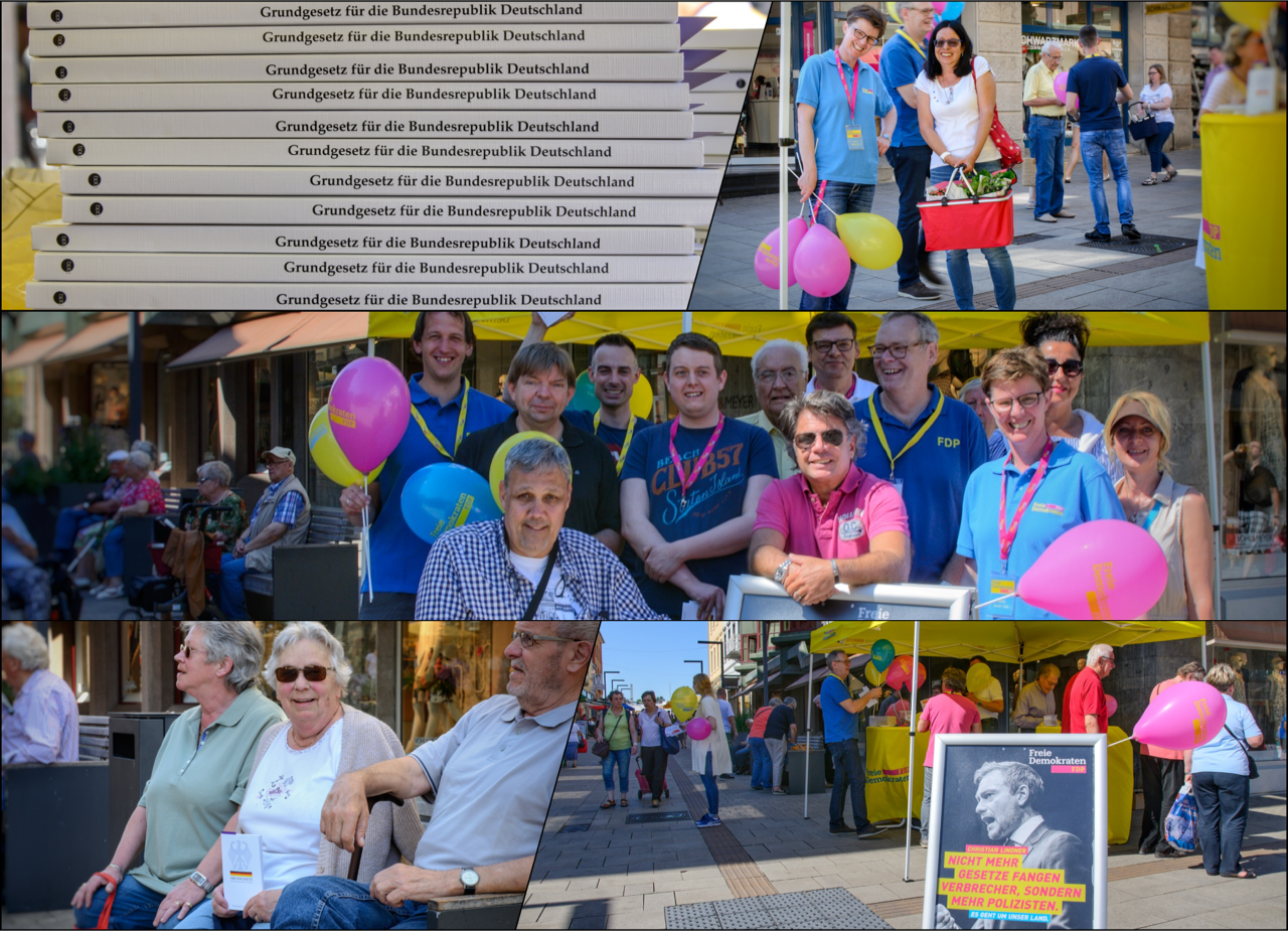 Info-Stand des FDP-Kreisverbandes zum Tag des Grundgesetzes in der Limburger Fußgängerzone. Den 68. Geburtstag feierte am 23. Mai unser Grundgesetz. Anlass für uns Freie Demokraten das Grundgesetz ein wenig zu feiern und das Grundgesetz zu verteilen. Es war sehr begehrt und schnell unser Bestand am Ende komplett aufgebraucht. Für uns Freidemokraten ist das Grundgesetz der Wertekompass für unser Land. Und es war sehr schön heute zu erleben, welch breite Wertschätzung, Respekt, ja Achtung es genießt. (MS)