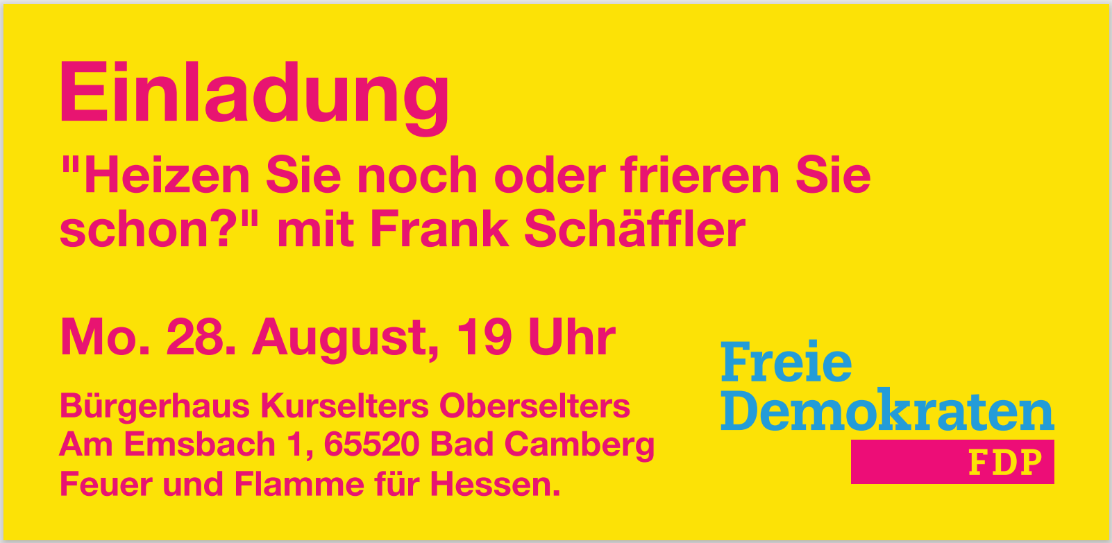 Wie geht es weiter mit dem Entwurf des Heizungsgesetz? Das Bundesverfassungsgericht hatte durch Beschluss die Verabschiedung vor der Sommerpause gestoppt. Die Sommerpause ist vorbei und es stellt sich die Frage, wie es weiter geht. Sind Änderungen erforderlich, wenn welche und wie ist es möglich? Was ist der Stand? Zu diesem Thema lädt die Kreis-FDP ein, zu einer Infoveranstaltung am Montag, den 28. August ab 19.00 Uhr im Bürgerhaus Kurhaus in Oberselters, Am Emsbach 1, Bad Camberg-Oberselters. Mit Gastredner Frank Schäffler wird der Experte der FDP-Bundestagsfraktion zu dem Thema an dem Abend Rede und Antwort stehen. Der FDP-Bundestagsabgeordnete hatte ganz maßgeblich Änderungen gegen den ursprünglichen Entwurf aus dem grünen Wirtschaftsministerium durchsetzen können. Vor den weiteren Beratungen dieses Gesetzes gibt Frank Schäffler als Insider einen aktuellen Einblick in den Stand der Debatte, die unterschiedlichen Positionen der Parteien und sinnvolle Handlungsoptionen. Die FDP lädt alle interessierten Bürgerinnen und Bürger ein, die Chance zu nutzen, sich zu diesem wichtigen Thema Informationen aus erster Hand zu erhalten.